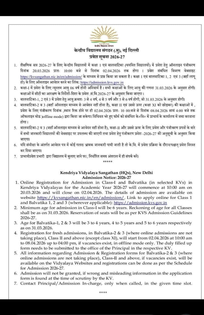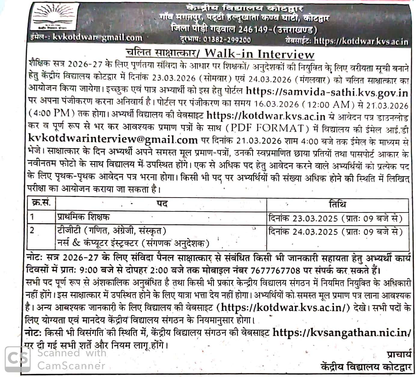 केंद्रीय विद्यालय कोटद्वार में शैक्षणिक सत्र 2026-27 हेतु प्रवेश प्रक्रिया प्रारंभ हो रही है, साथ ही विद्यालय में विभिन्न विषयों के लिए संविदा शिक्षकों की भर्ती भी की जा रही है।