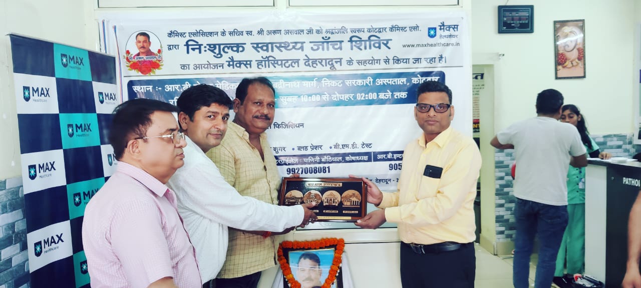 कोटद्वार केमिस्ट एसोशियेसन के पूर्व सचिव स्वर्गीय अरुण असवाल को श्रद्धांजलि अर्पित करते हुए कल फ्री मेडिकल कैंप का आयोजन किया गया। केमिस्ट एसोशियेसन के अध्यक्ष विवेक अग्रवाल ने बताया की कैंप में कोषाध्यक्ष पाणीनी बौठियाल, मैक्स हॉस्पिटल से आए डॉ योगेंद्र सिंह, प्रेम नारायण, सिराज और श्रीमती कांता असवाल द्वारा स्वर्गीय अरुण असवाल के चित्र को माल्यार्पण कर पुष्पांजलि दी गई।