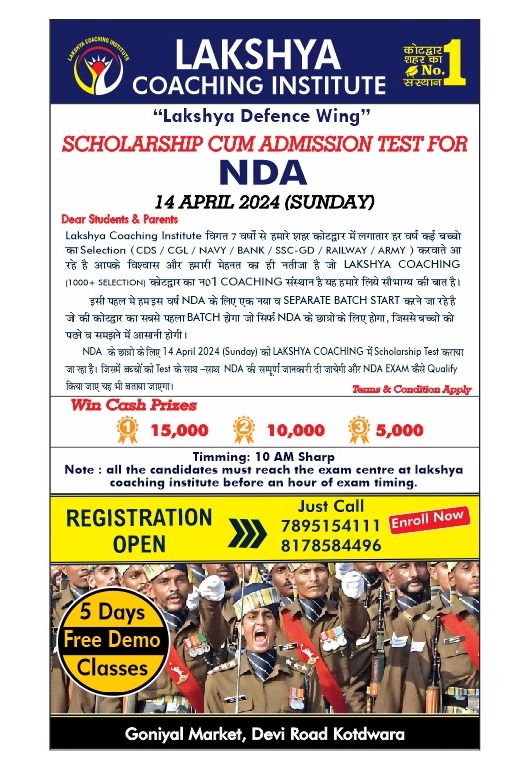 NDA के छात्रों के लिए 14 अप्रैल 2024 (Sunday) को लक्ष्य कोचिंग इंस्टिट्यूट में स्कॉलरशिप टेस्ट कराया जा रहा है। जिसमें छात्रों को टेस्ट के साथ-साथ NDA की संपूर्ण जानकारी दी जाएगी और NDA एग्जाम कैसे क्वालीफाई किया जाए यह भी बताया जाएगा।