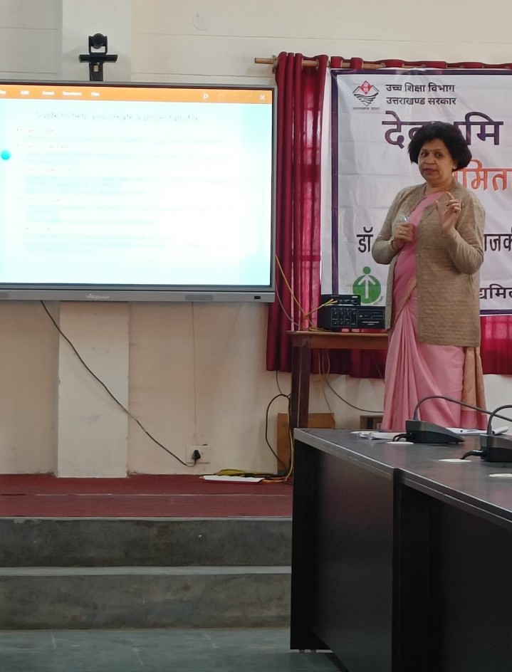 कार्यक्रम के द्वितीय सत्र में महाविद्यालय की जंतु विज्ञान विभाग की असिस्टेंट प्रोफेसर डॉ सुनीता नेगी ने प्रोजेक्ट प्रोफाइल शीर्षक के महत्व को समझाते हुए बताया कि भविष्य में एक सफल उद्यमी बनने के लिए उद्यमी की प्रोजेक्ट प्रोफाइल स्मार्ट एवं आकर्षक होनी चाहिए, जिससे कि प्रोजेक्ट प्रोफाइल का उद्देश्य स्पष्ट हो सके। डॉ नेगी ने प्रतिभागियों को स्वोट एनालिसिस के माध्यम से प्रोजेक्ट प्रोफाइल विषय को विस्तार से समझाया।